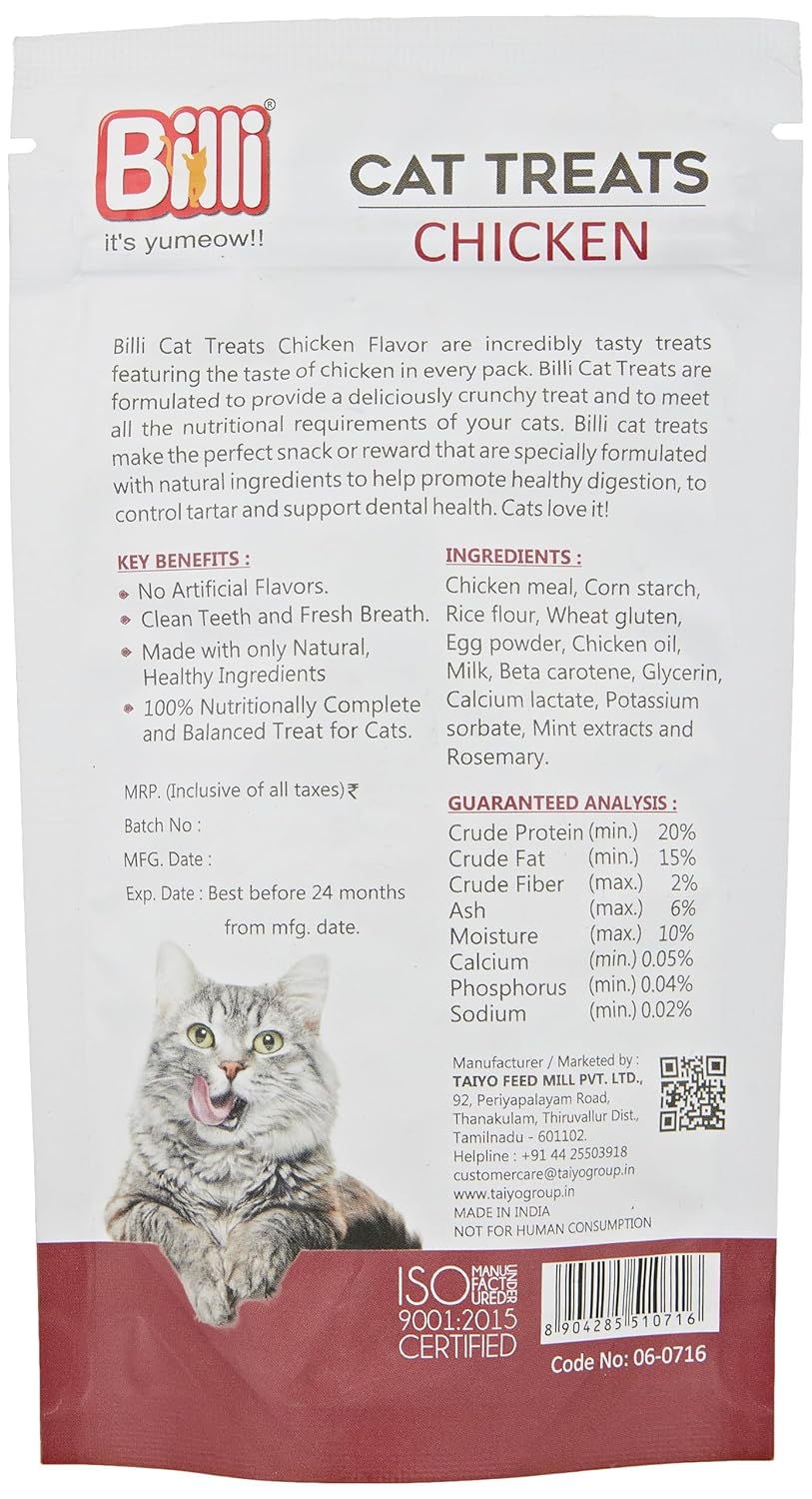 TAIYO Billi Chicken Cat Treats – Crunchy Bites is a Premium chicken-flavored cat treat with real chicken meal. Nutritionally complete formula with natural ingredients including mint extracts and rosemary for dental health and fresh breath.