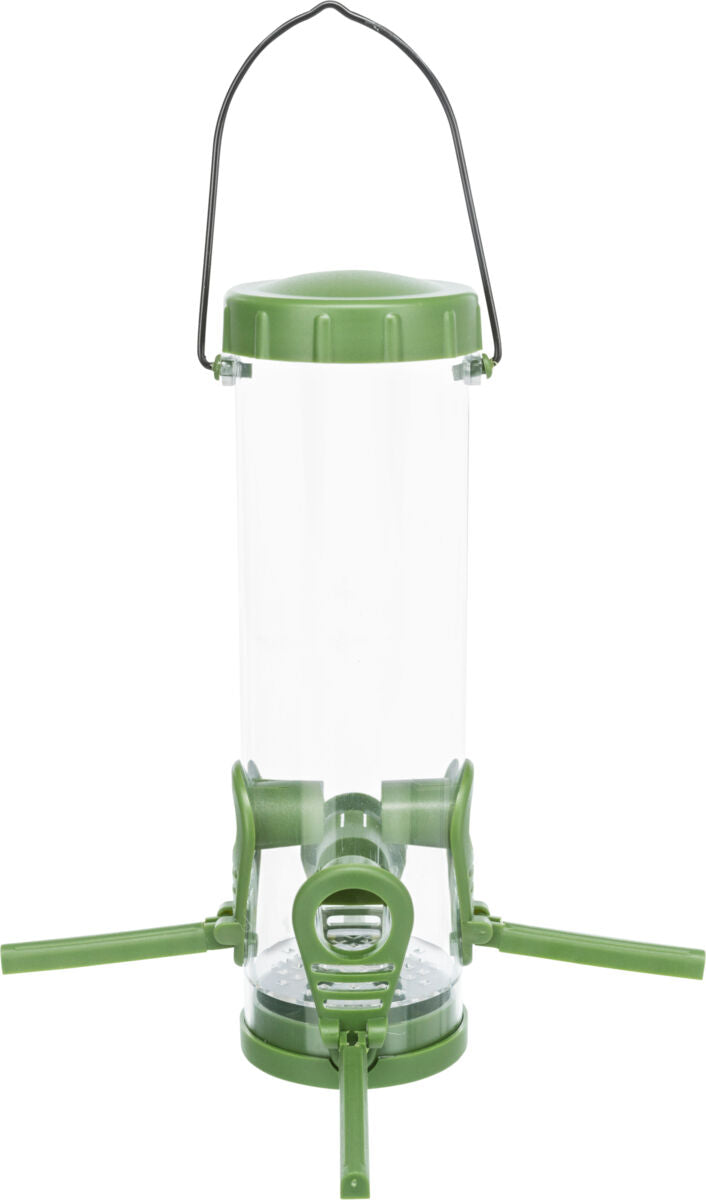 TRIXIE Outdoor Plastic Bird Feeder 450ml is a Durable hanging bird feeder with 4 landing perches designed for wild bird feeding in gardens and outdoor spaces. Weather-resistant 23cm tube feeder keeps seeds clean and dry for optimal bird attraction.