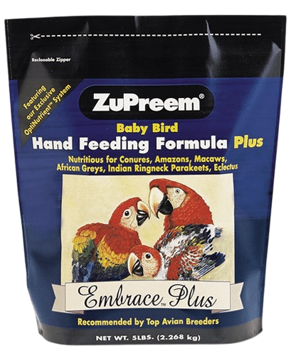 ZuPreem Embrace Plus Baby Bird Hand Feeding Formula (5 lbs/2.268 kg) is a Premium hand-feeding formula designed for conures, amazons, macaws, African greys, Indian ringneck parakeets, and eclectus chicks.