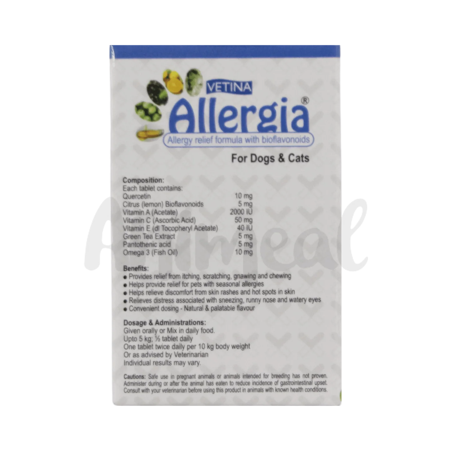 VETINA Allergia provides effective relief from pet allergies with a scientifically formulated blend of natural ingredients. This veterinary-grade supplement helps manage itching, scratching, hot spots, and seasonal allergies in both dogs and cats.