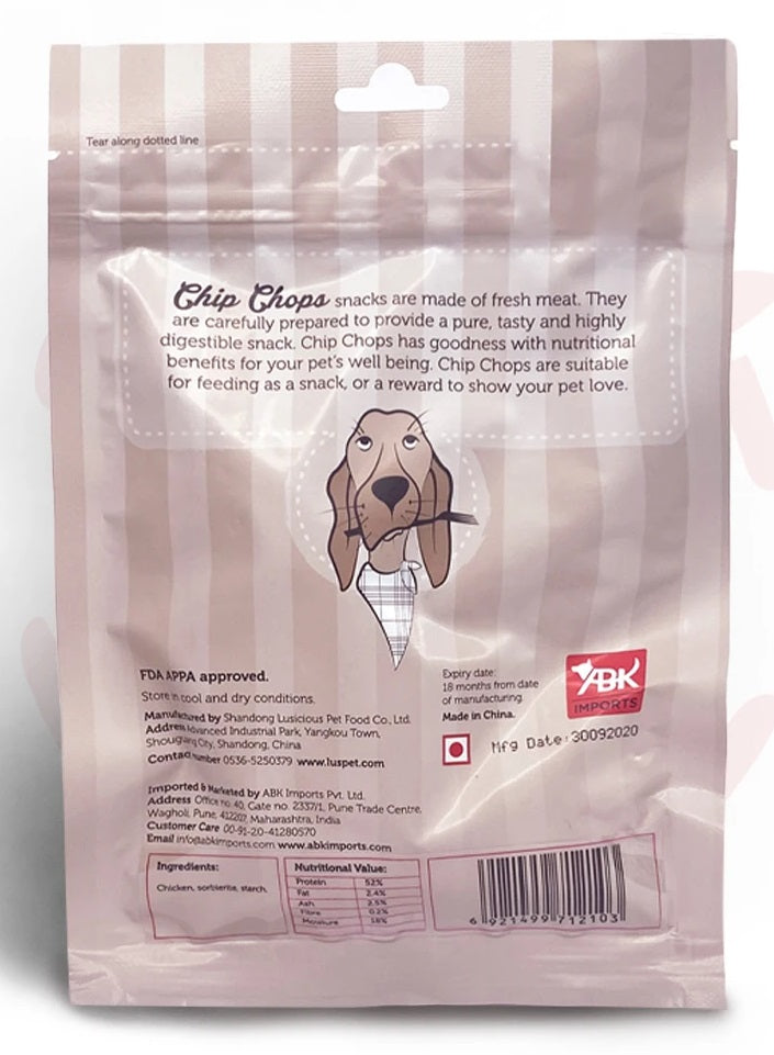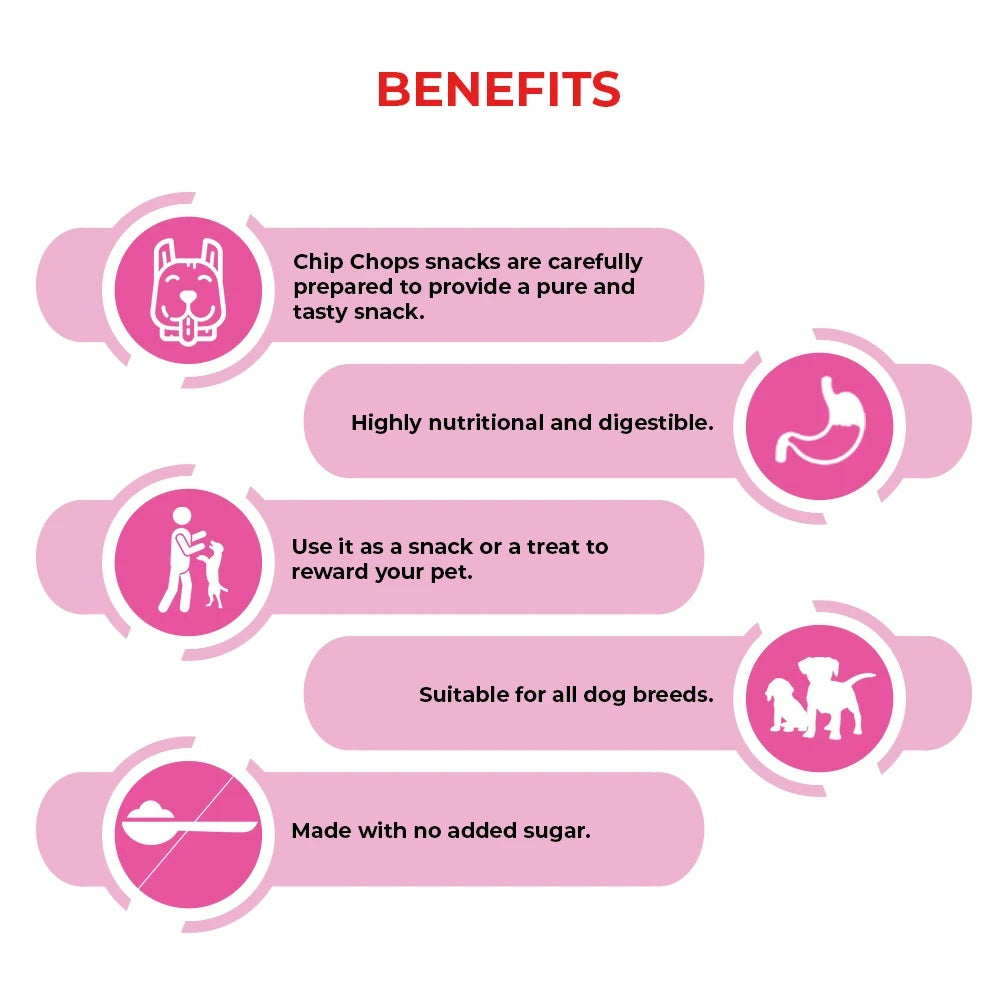 Chip Chops Dried Chicken Jerky Dog Treats are premium dried chicken jerky made from fresh meat with optimal health formula. Pure, tasty and highly digestible snack with nutritional benefits for your pet's well-being.