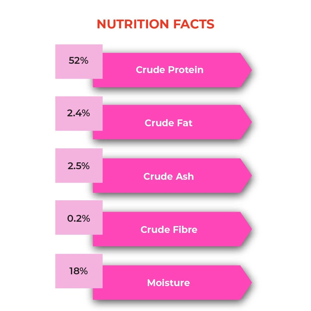 Nutritional Info: Protein 52%, Fat 2.4%, Fiber 0.2%, Moisture 18%