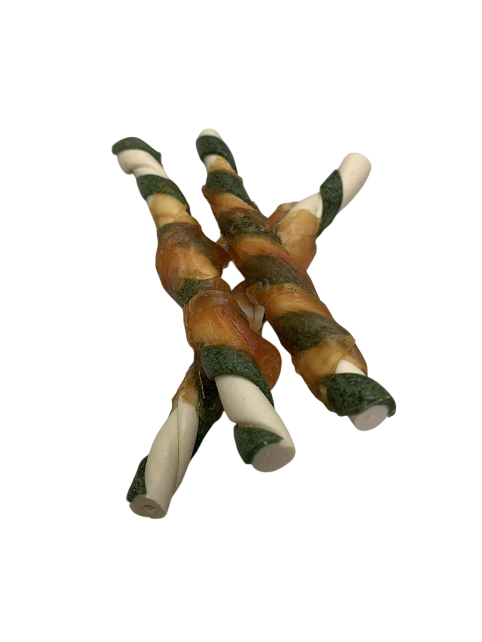 Dogaholic SuperBone All Natural Dog Treats - Olive Oil Flavor are premium all-natural stick treats featuring real chicken and Mediterranean olive oil in a distinctive seaweed-wrapped design for unique flavor that dogs crave.