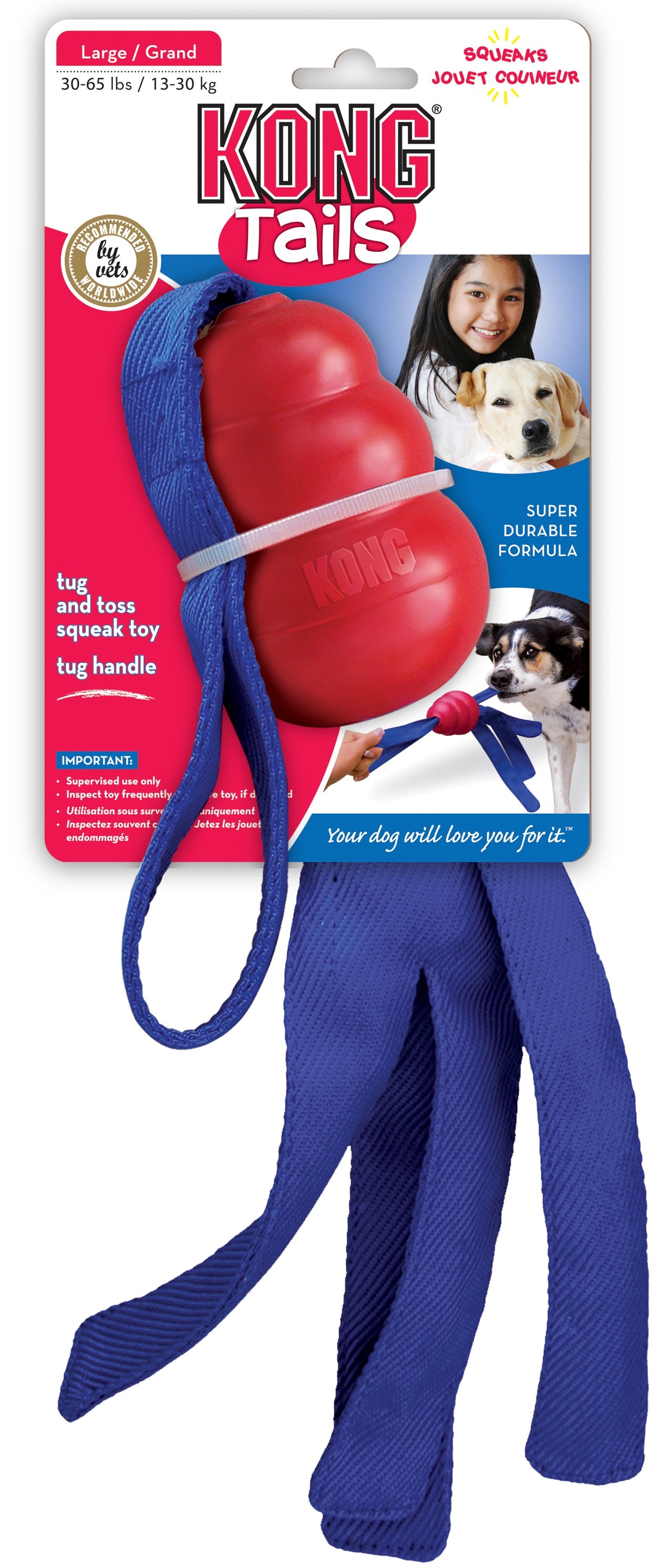Strong, textured tails provide an easy grip for tug games.