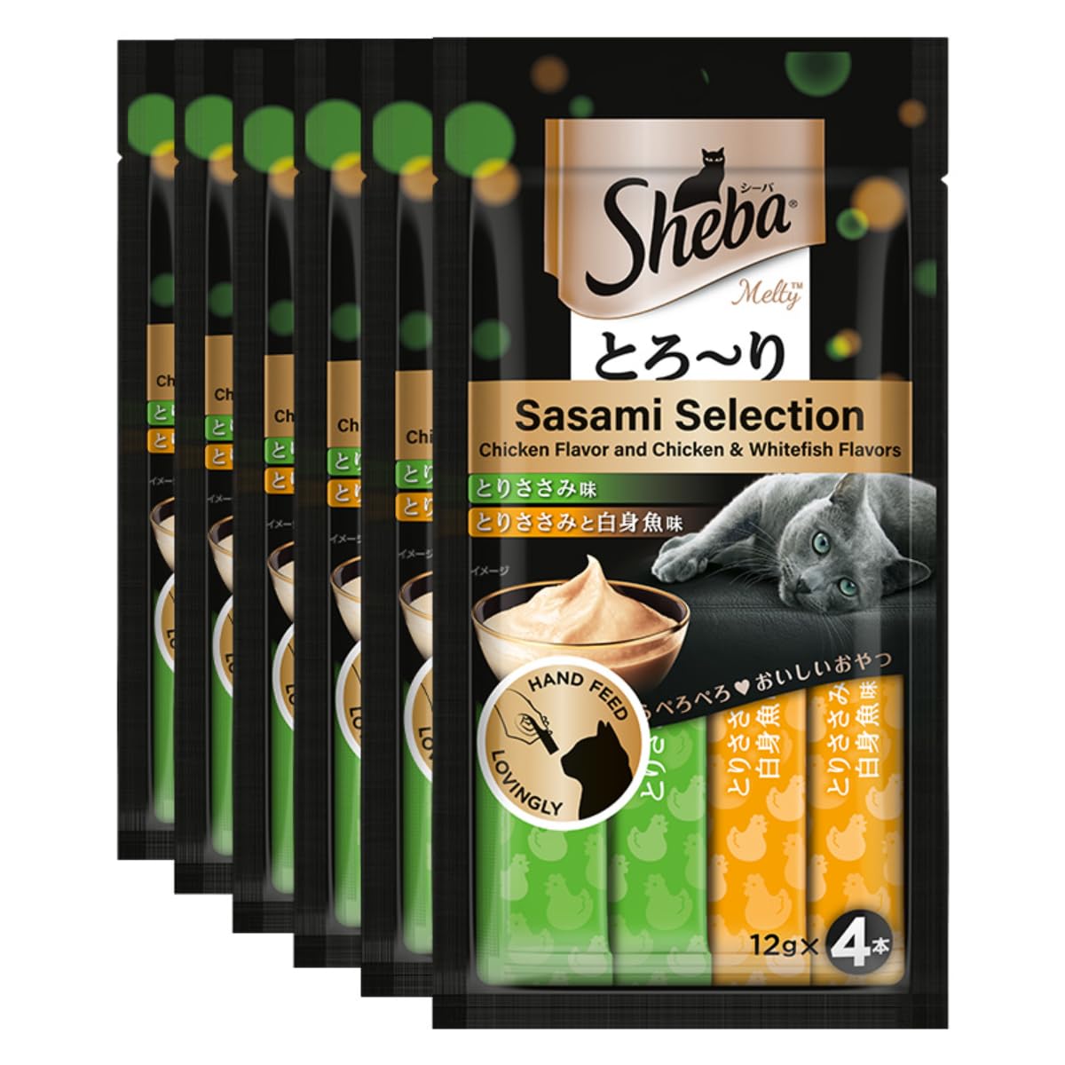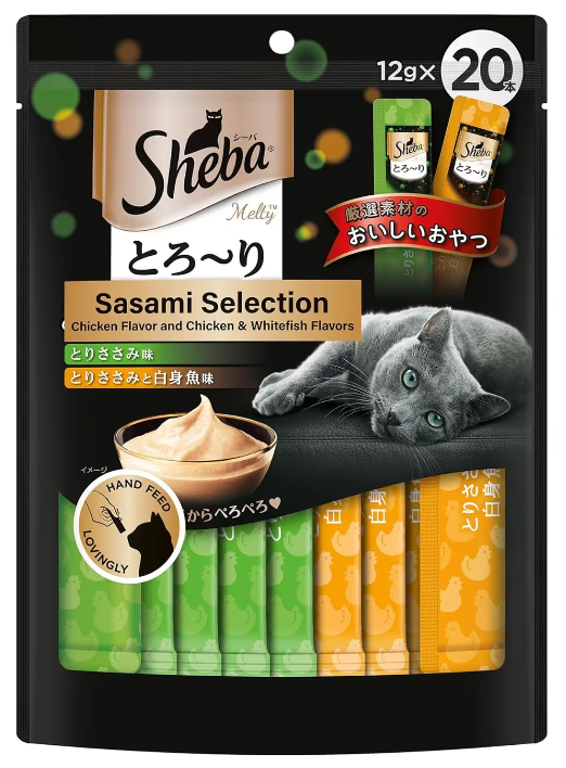 Sheba Melty Toro-ri Sasami Selection offers premium lickable cat treats featuring carefully selected chicken (sasami) flavors in a convenient variety pack. This Japanese-style treat includes two delicious options: pure chicken flavor and chicken with whitefish flavor. Each package contains 20 individually portioned 12g servings designed for hand-feeding to create special bonding moments with your adult cat.