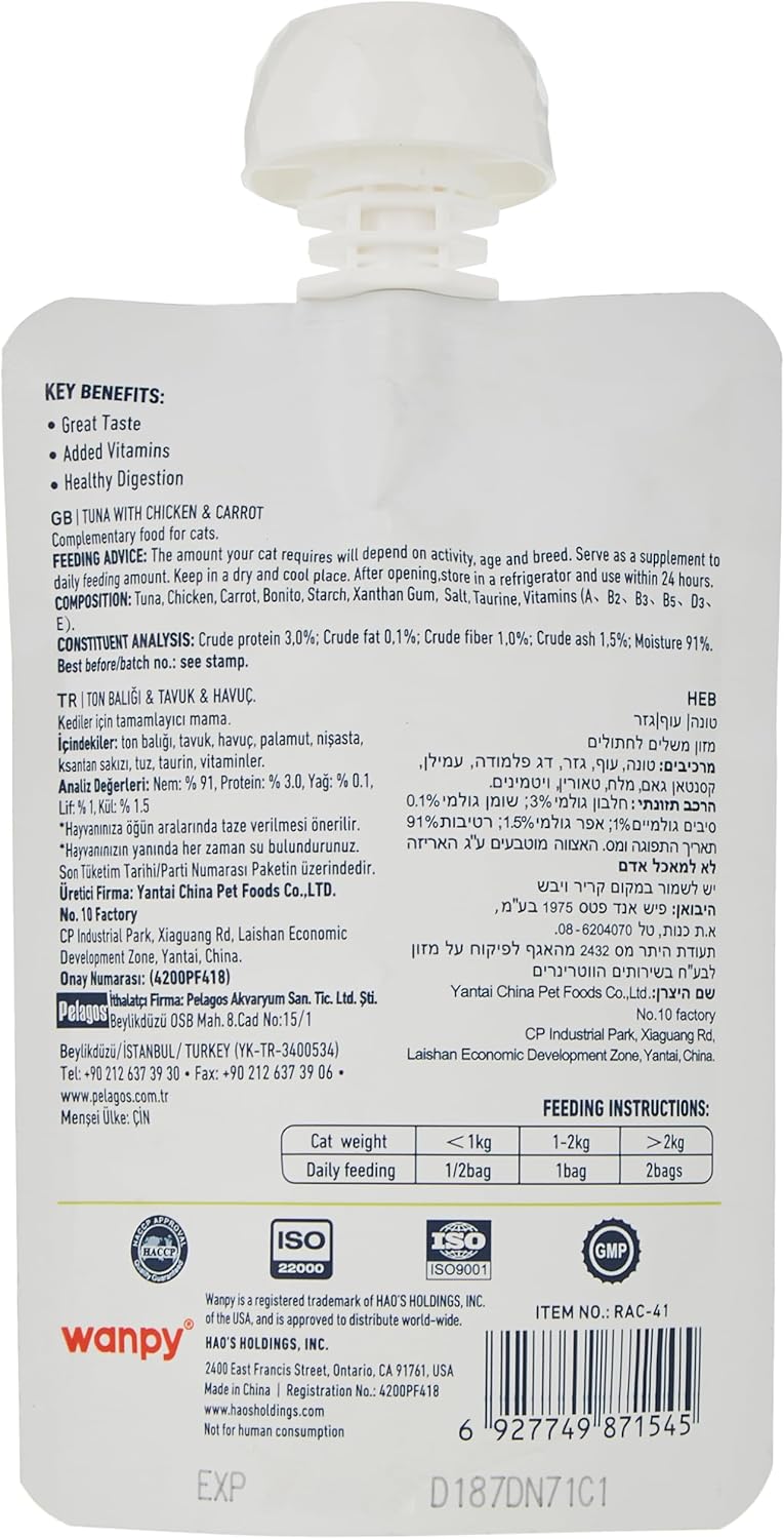 Wanpy Tasty Meat Paste – Tuna with Chicken & Carrot Cat Treat is a Premium tuna with chicken & carrot in a lickable squeeze pouch. Protein-rich wet cat treats with irresistible seafood flavor cats crave.
