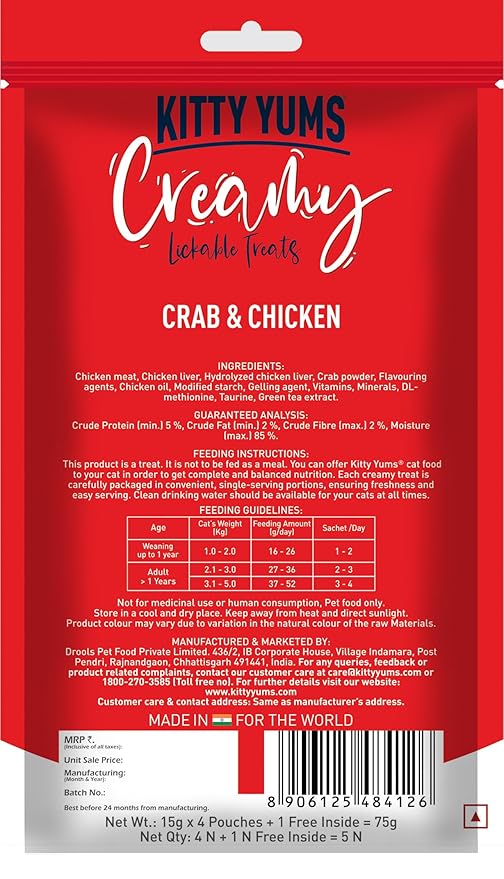 Kitty Yums Creamy Lickable Crab & Chicken Cat Treats – Buy 4 Get 1 Free are premium individually-wrapped pouches with real chicken and crab, engineered for portion-controlled feeding and extended freshness.