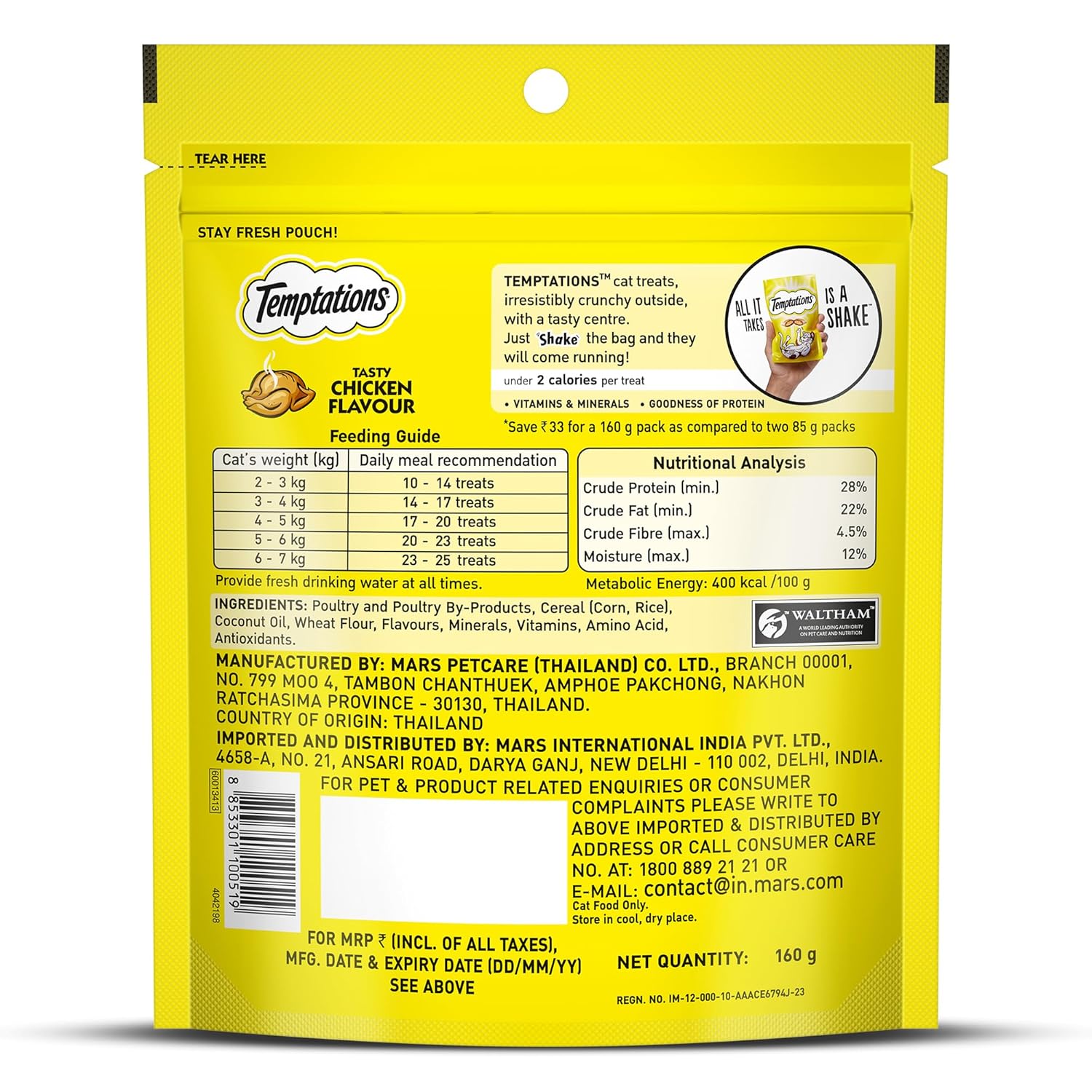 Temptations Chicken Flavour treats are dual-textured snacks designed for adult cats, featuring a soft inside with a crunchy outside shell. This value pack contains 160g of chicken-flavoured treats with under 2 calories per treat, making them suitable for regular rewarding and bonding moments with your cat.
