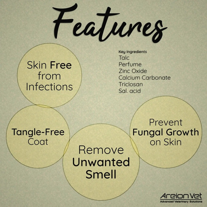- Areion Vet Petalc Ultra Fine Perfumed Talc helps getting rid of excess oil and foul smell from a coat.