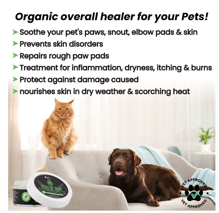Wiggles Heal O'Rub is a Veterinary-Approved 100% Organic Paw & Skin Protection Balm with Hemp Seed Oil for Dogs & Cats. Natural healing balm with argan oil, coconut oil, and shea butter designed to protect, moisturize, and heal paw pads, dry skin, cuts, and hot spots.