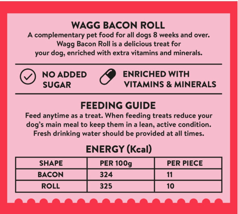 Wagg Bacon Roll – Tasty Bites with Pork Dog Treats is a Premium pork-flavored dog treat with real bacon taste and no added sugar. Vitamin and mineral enriched complementary food designed for dogs 8 weeks and over with authentic pork meal for irresistible flavor.