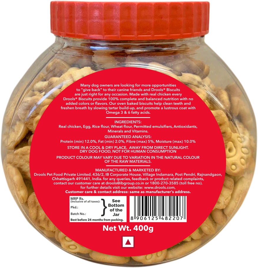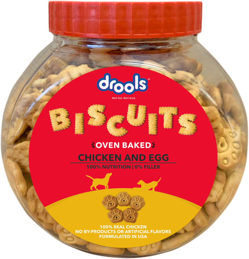 Drools Chicken & Egg Oven-Baked Dog Biscuits (Jar) feature 100% real chicken with no by-products or artificial flavors for complete and balanced nutrition.