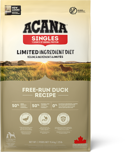 Limited ingredient doesn’t mean less meat. ACANA Singles Free-run Duck is loaded with 50%* quality duck ingredients in WholePrey ratios, complemented with whole, delicious Bartlett pears, providing your dog with the protein and nutrients they need in order to stay happy, healthy, and strong.