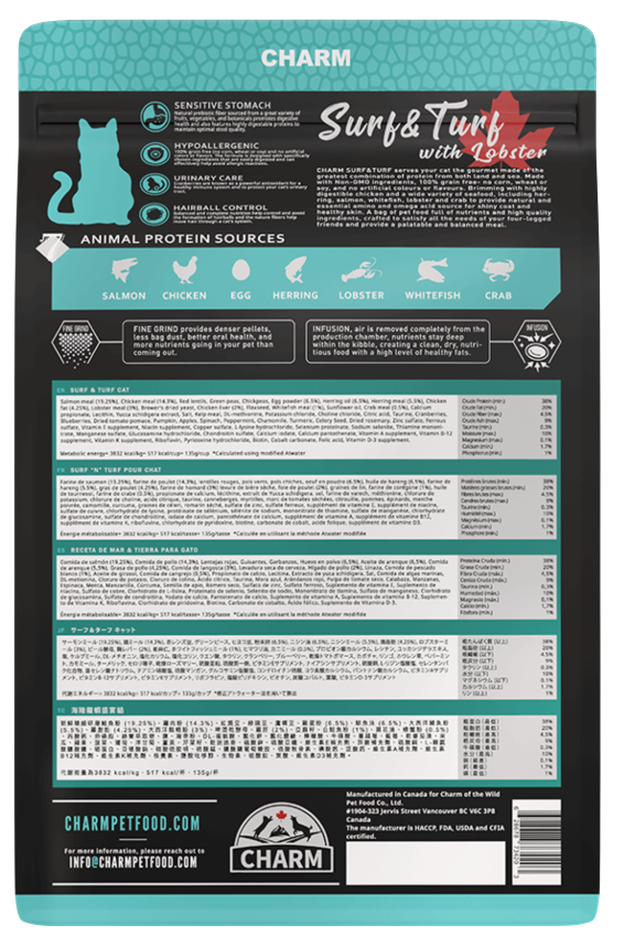 Charm Surf & Turf with Lobster is a grain-free premium dry cat food made in Canada, crafted for lovers of the land and sea. This recipe features high inclusions of meat and seafood, including lobster from the cool waters of Canada's Atlantic Ocean. The perfect variety of locally sourced meat and seafood to provide your cat with all the nutrients needed to thrive. Whether your cat likes to stay indoors or go outside to explore, this protein-rich recipe is sure to keep your cat happy and healthy.