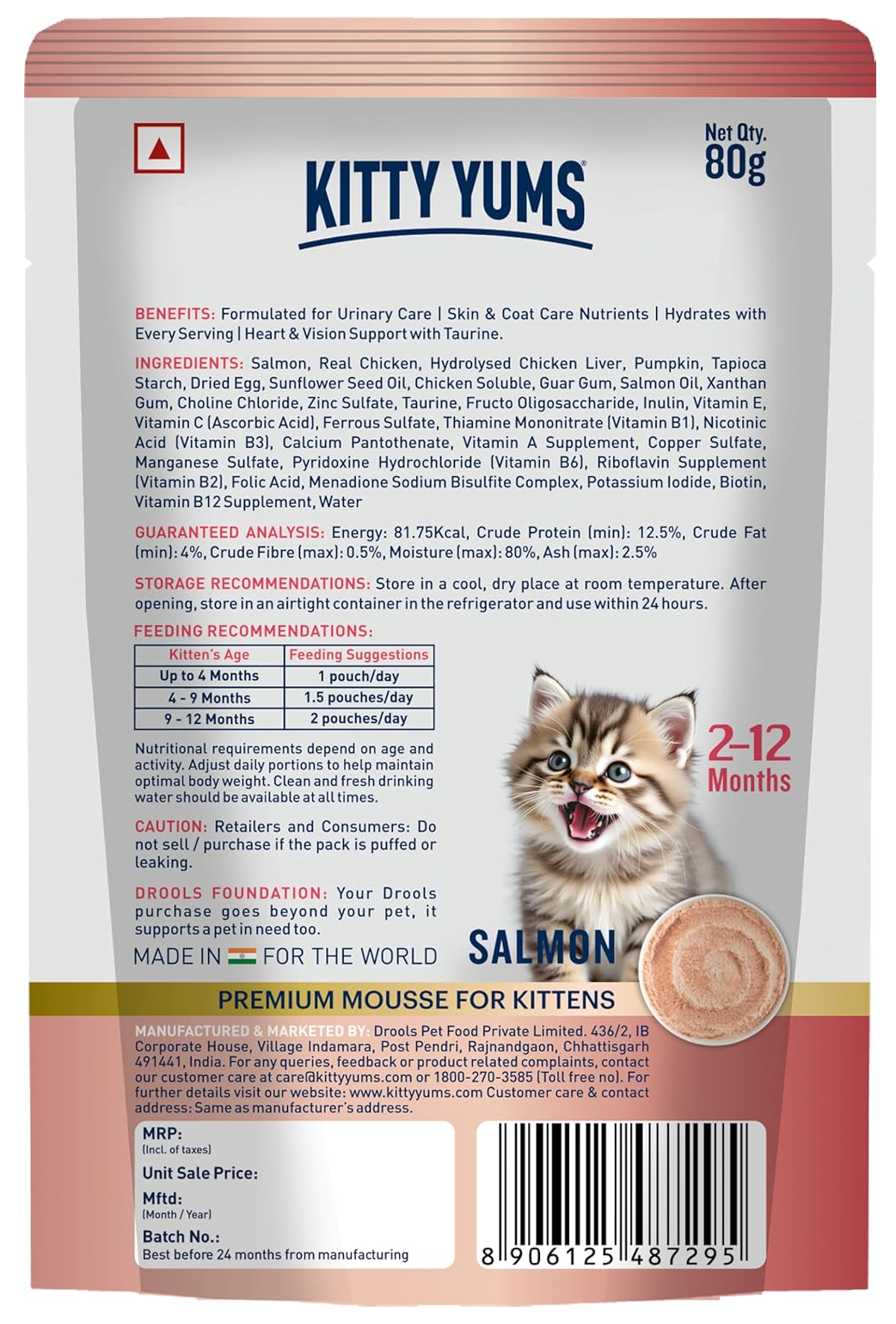 Kitty Yums Salmon Premium Mousse is a specially formulated complete diet for kittens aged 2-12 months. This grain-free mousse features salmon as the primary protein source, providing essential omega-3 fatty acids and high-quality nutrition in a smooth, easy-to-eat texture. Each 80g pouch delivers complete nutrition to support your kitten's rapid growth and development during this crucial life stage.