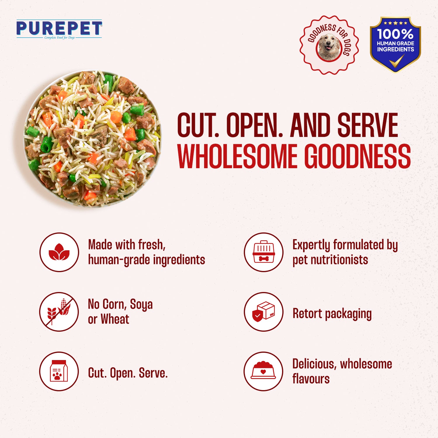 Say hello to Purepet Chef's Style Homemade Meals — cooked with care, backed by science! Purepet Mutton Biryani is a ready-to-eat meal crafted with fresh, 100% human-grade ingredients and expertly formulated by pet nutritionists to support your dog's health and energy levels. Slow-cooked in a modern kitchen, each flavourful recipe retains essential nutrients and offers the comfort of a lovingly prepared, home-style dish. Complete and balanced, this wholesome option delivers the authentic taste of homemade goodness with 65% meat and 35% veggies & rice. Packed in retort packaging, it stays naturally fresh without the use of preservatives. Cut – Open – Serve.