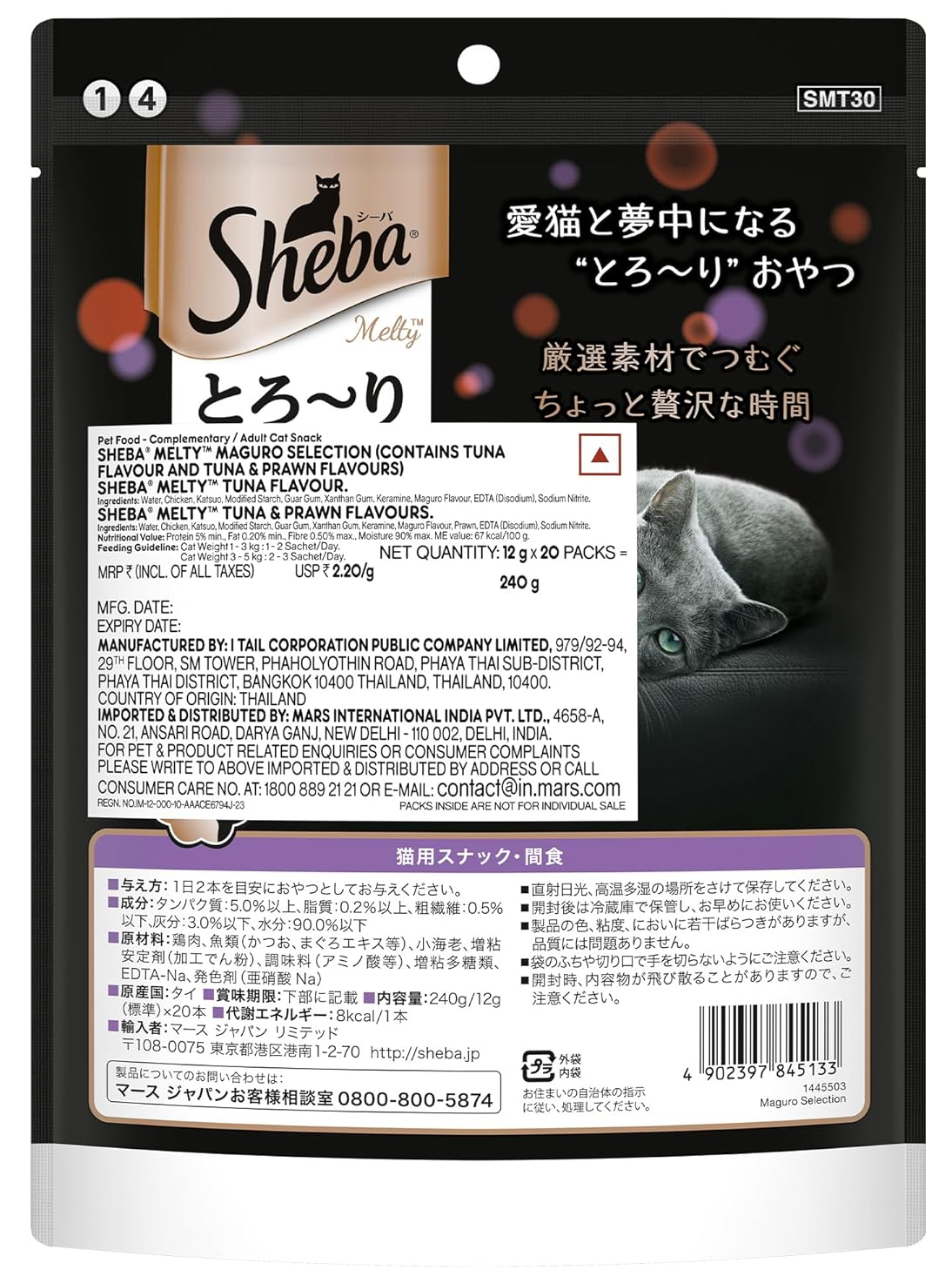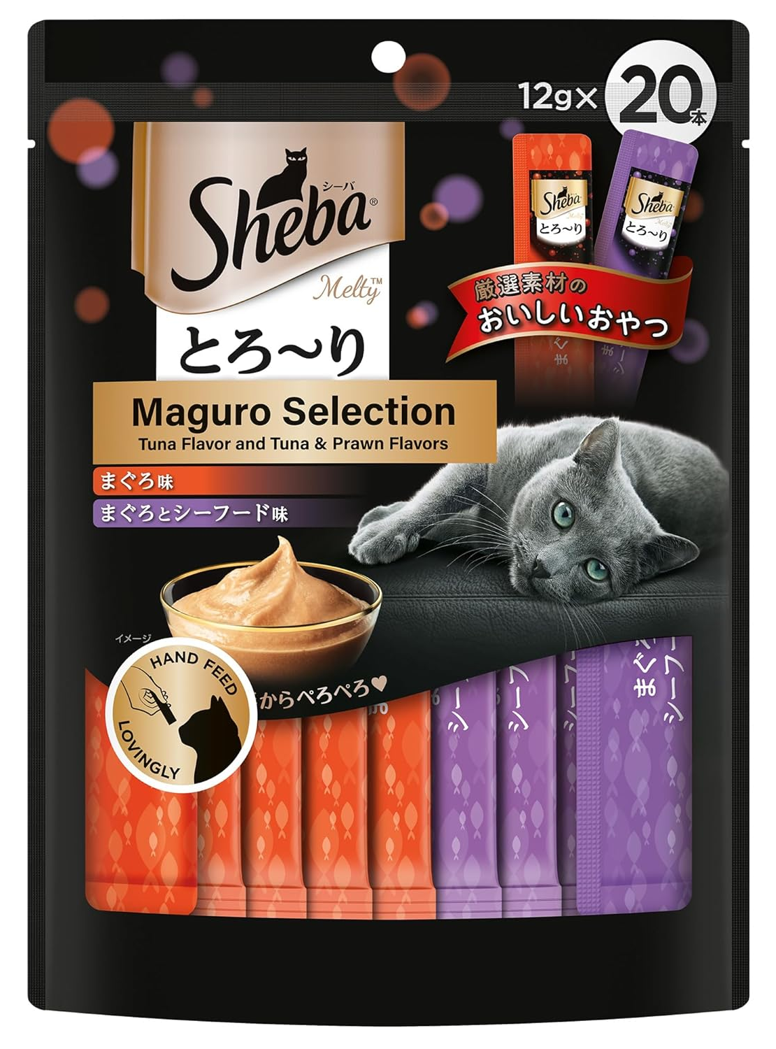 Sheba Melty Toro-ri Maguro Selection offers premium lickable cat treats in a variety pack featuring tuna & prawn flavors. This Japanese-style treat comes in easy-to-serve pouches designed for hand-feeding to create bonding moments with your adult cat. Each pack contains 20 individually portioned 12g servings in two flavor varieties.