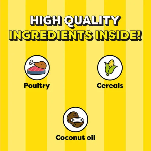 Poultry and Poultry By-Products, Cereal (Corn, Rice), Coconut Oil, Wheat Flour, Flavours, Minerals, Vitamins, Amino Acid, Colour, Antioxidants
