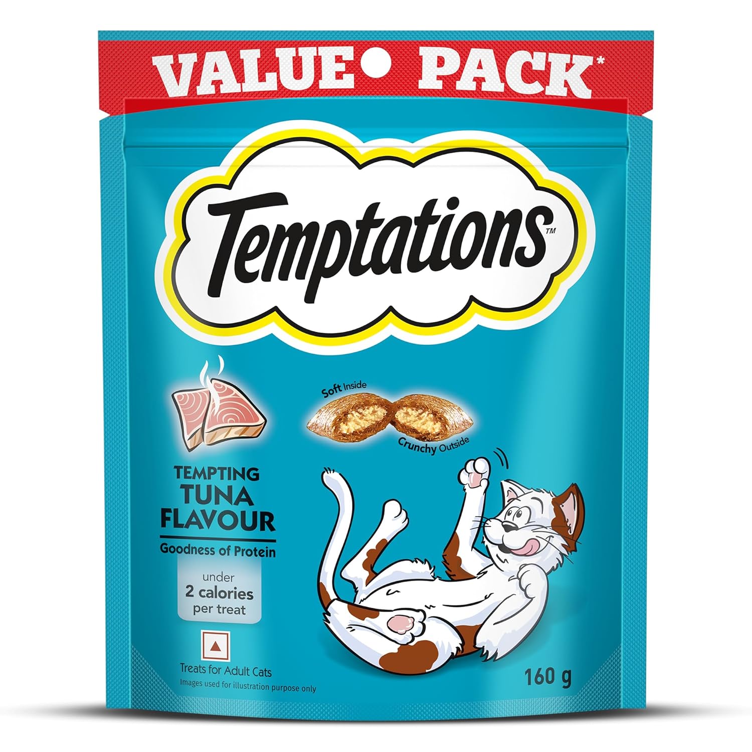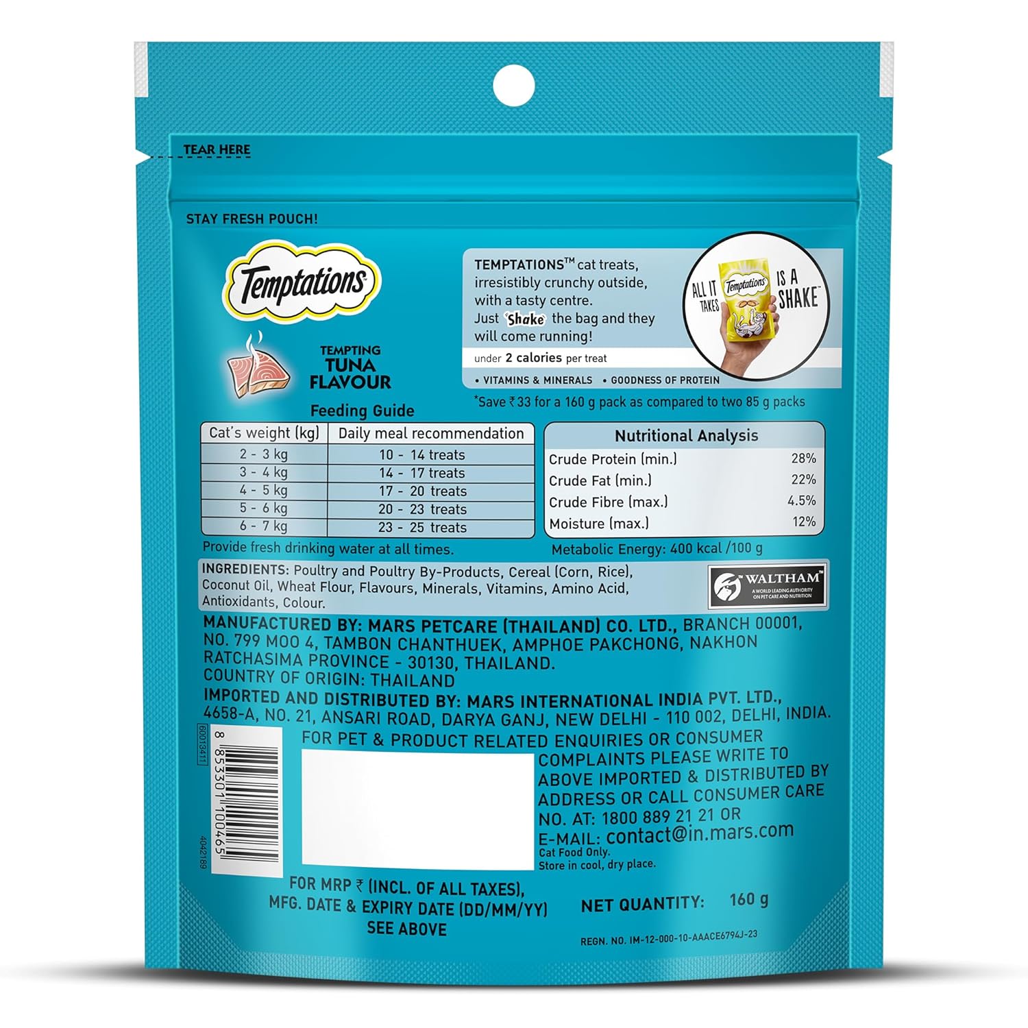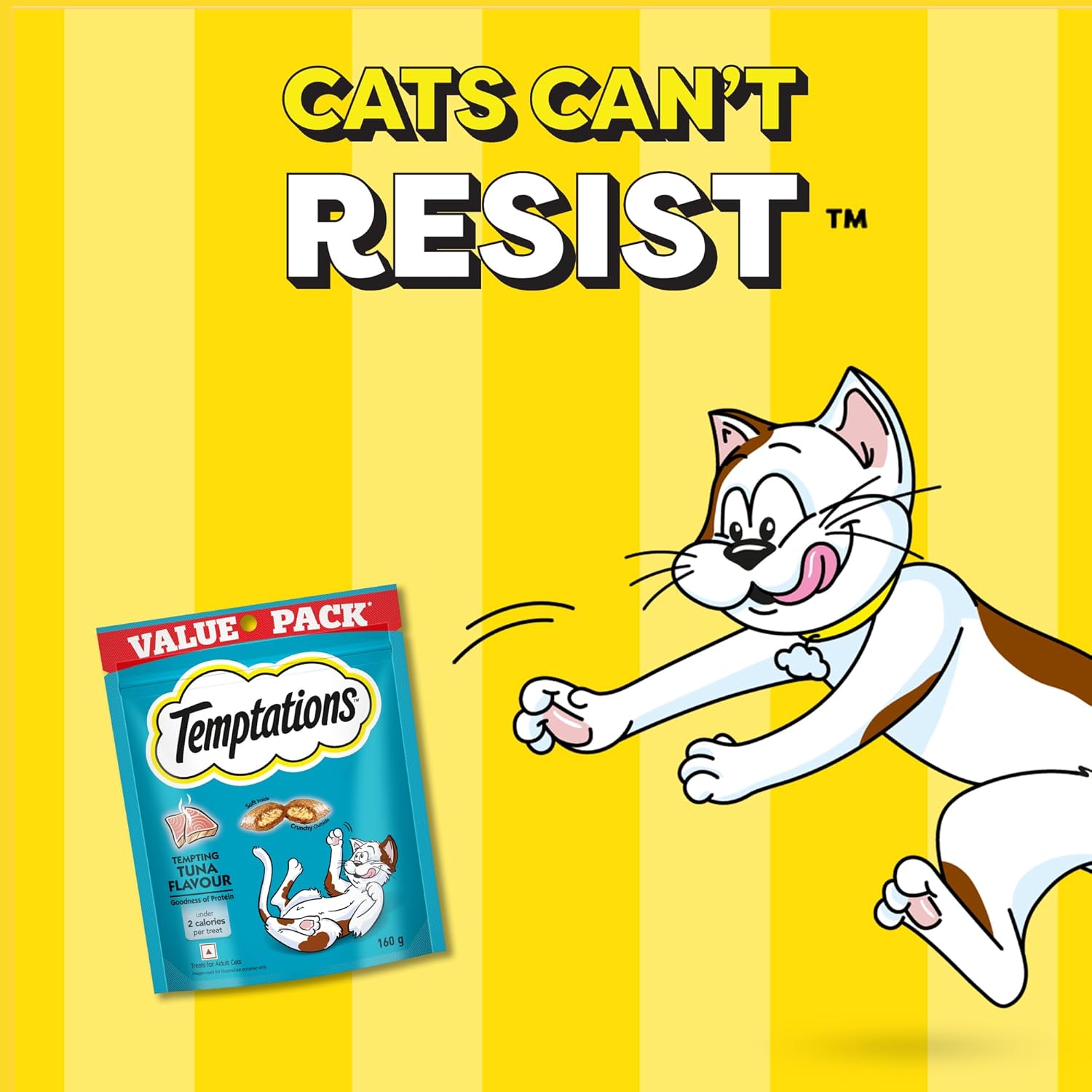 Temptations Tempting Tuna Flavour treats are dual-textured snacks designed for adult cats, featuring a soft inside with a crunchy outside shell. This value pack contains 160g of tuna-flavoured treats with under 2 calories per treat, making them suitable for regular rewarding and interactive play with your cat.
