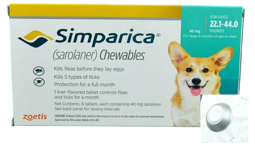 Zoetis Simparica 40mg (Sarolaner) Chewable Tablet For Dogs (22.1-44.0 lbs) - 1 Tablets