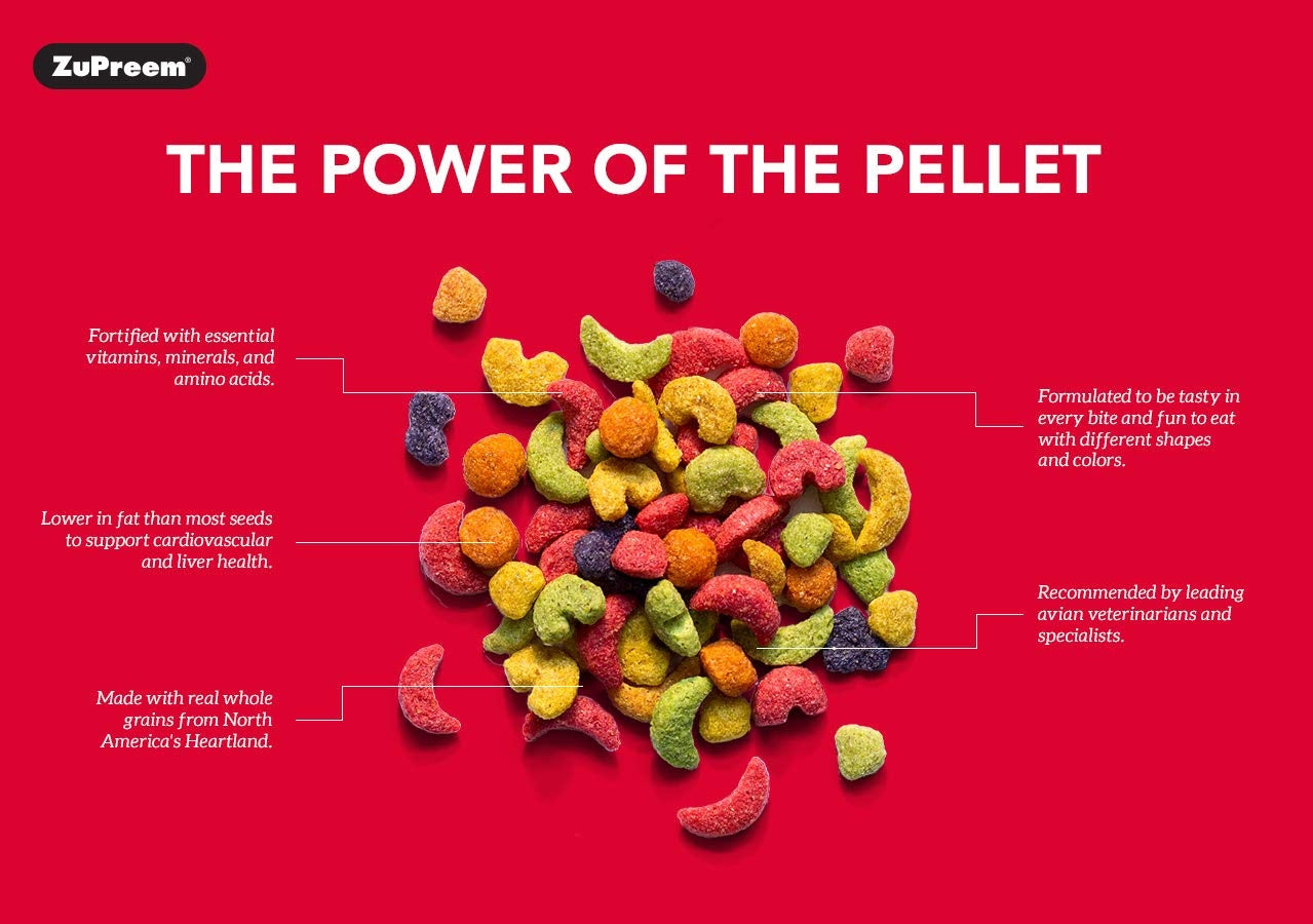 ZuPreem FruitBlend Flavor Bird Food for Medium Birds - Natural Fruit Flavors is a Premium daily bird food for medium-sized birds featuring colorful fruit-shaped pellets with natural fruit flavors and complete nutrition since 1968.
