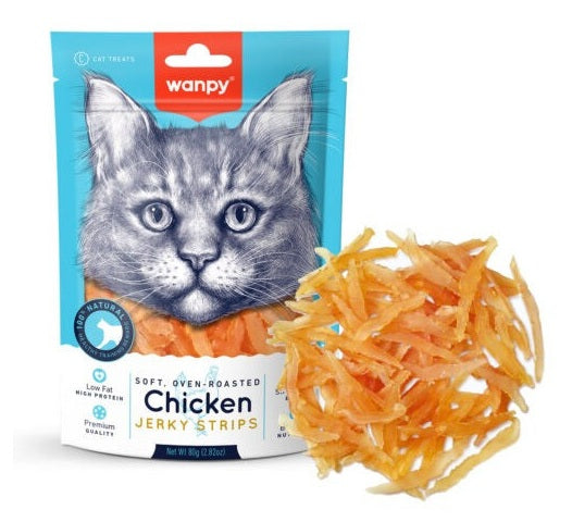 Wanpy Soft Oven-Roasted Chicken Jerky Strips for Cats (80g) is a Premium natural chicken jerky treat for cats. Soft texture perfect for felines including seniors with dental sensitivities. High protein, low fat formula supports lean muscle development.