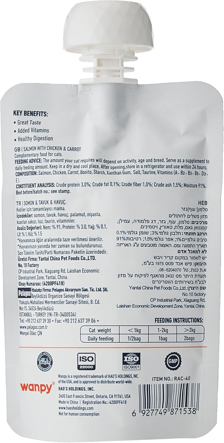 Wanpy Tasty Meat Paste – Salmon with Chicken & Carrot Cat Treat is a Premium salmon with chicken & carrot in a lickable squeeze pouch. Omega-3 enriched wet cat treats for healthy coat and brain function.