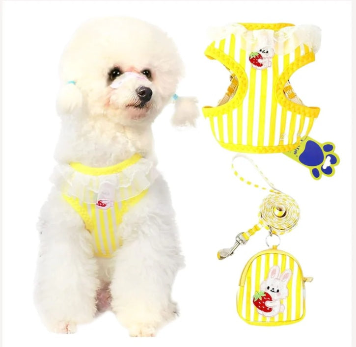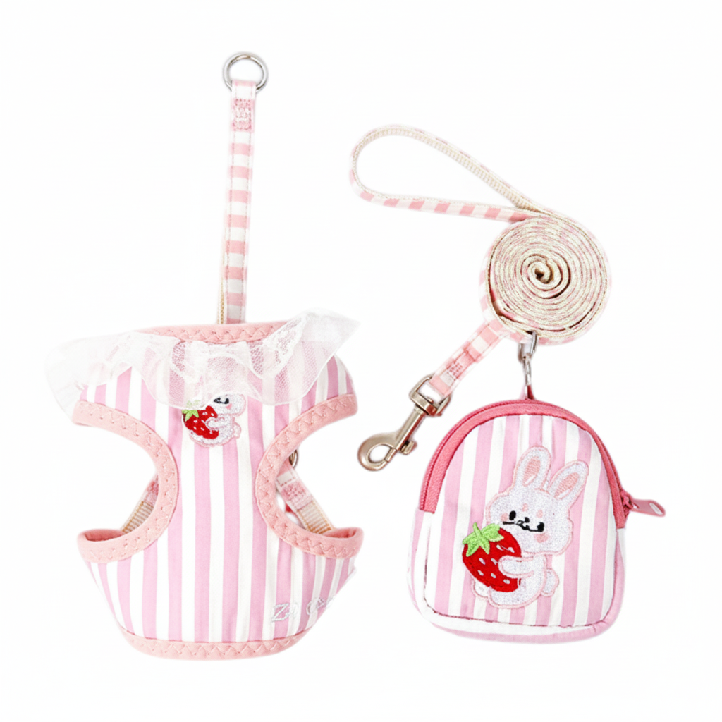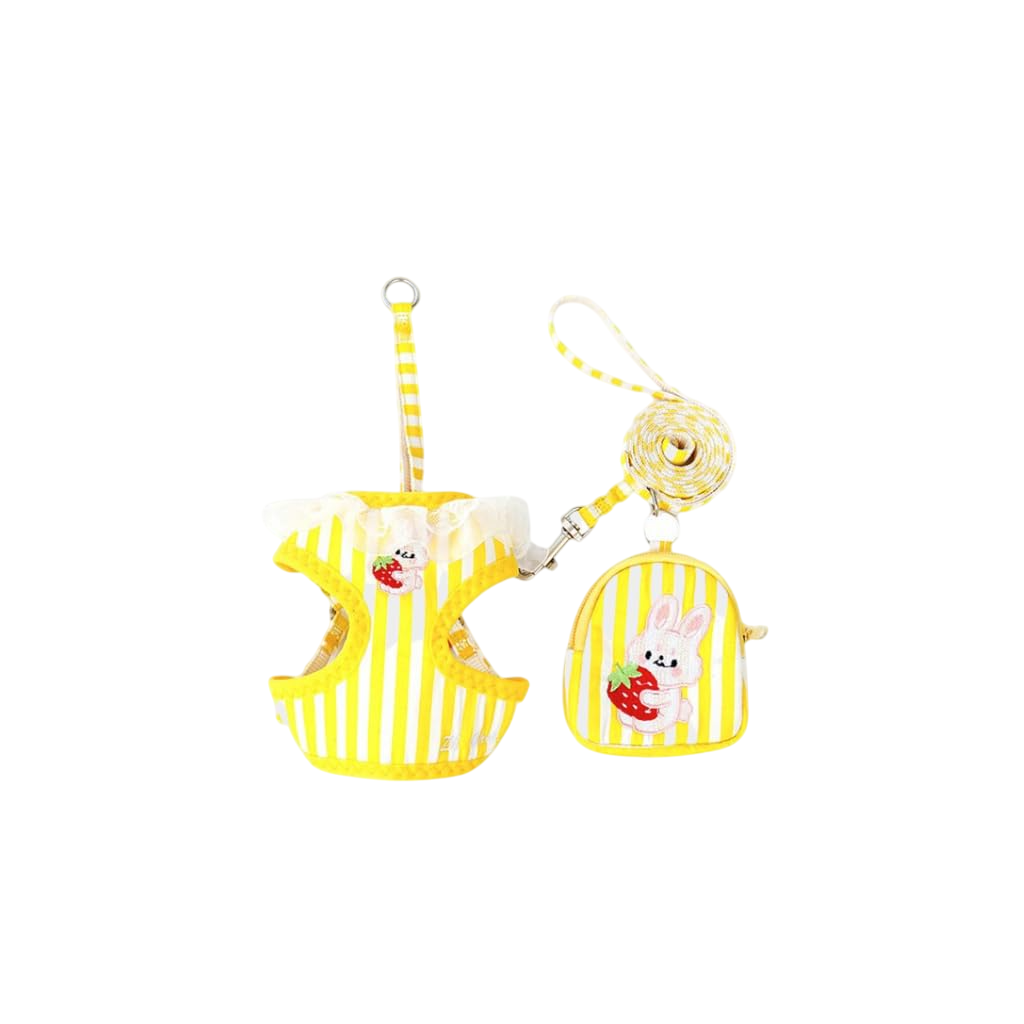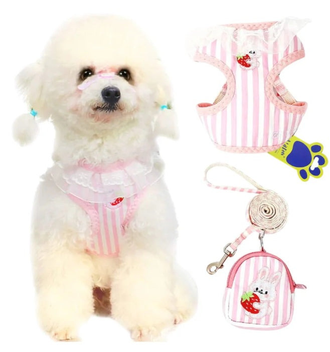 The matching leash offers strong grip and durability, and the cute mini bag is perfect for carrying treats, poop bags, or small essentials. With charming striped patterns and playful bunny design details, this harness set combines fashion and function for everyday outings.