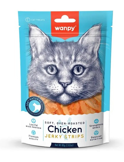 Wanpy Soft Oven-Roasted Chicken Jerky Strips for Cats (80g) is a Premium natural chicken jerky treat for cats. Soft texture perfect for felines including seniors with dental sensitivities. High protein, low fat formula supports lean muscle development.