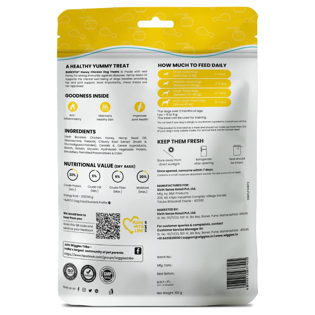 Wiggles Barkstix Honey Chicken – Healthy Dog Treats is a Premium functional dog treats with honey chicken in stick form. Multi-benefit treats with glucosamine, hemp seed oil, and prebiotics for joint health and immunity.